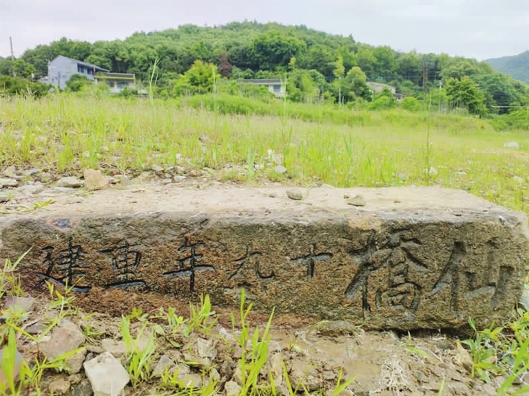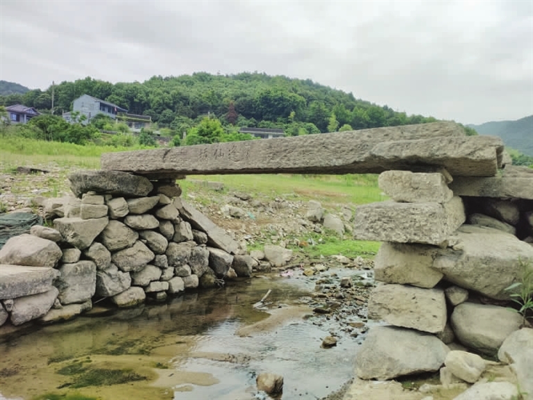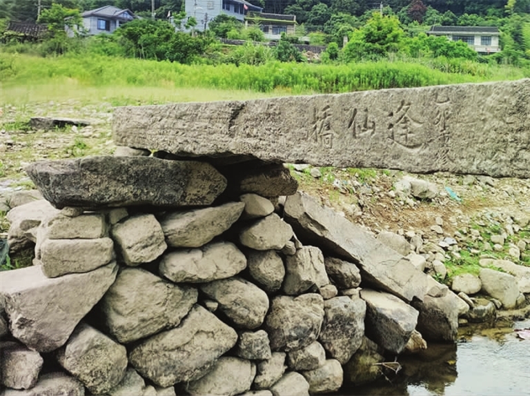 古桥附近数米处,还有一处断桥石条横卧地上,宽0.43米,高约0.22米,长约1米多(露出地面部分),断石条上刻有“仙桥十九年重建”,少了一个“逢”字。