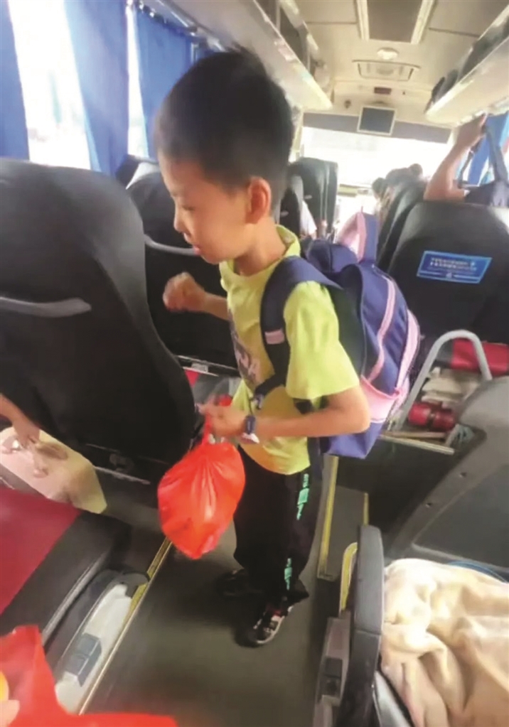 一路上,两位司机师傅和乘务员除了本职工作,还承担起了家长的角色。发车前他们会仔细检查孩子们的安全带是否系好,换班休息时帮孩子们整理行李架上的杂物,提前带晕车的孩子坐到前排,为他们准备好垃圾袋。中午到服务区休息时,还要带一些年龄小的孩子去吃饭以及上厕所,最后一个不落地带回车上,平平安安地送到家长们手上。