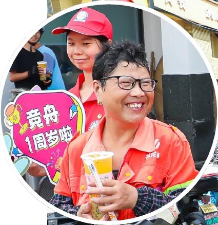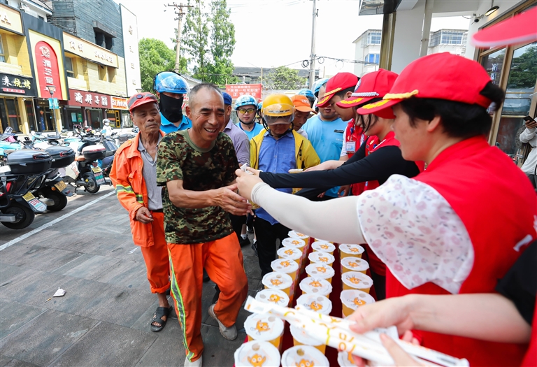 昨天,“竞舟”上线一周年,定海芙蓉洲路新就业群体驿站附近,志愿者把728杯奶茶送给高温下的劳动者 记者 张磊 摄