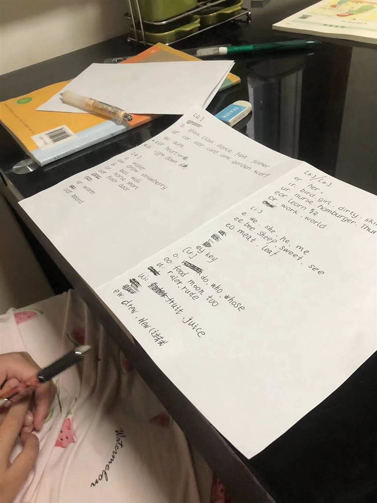 徐家汇说,她现在带的三个学生都是妈妈同事的孩子,教学内容基本是他们课本内的英语单词和课文,也会在学习单词中穿插音标的学习。