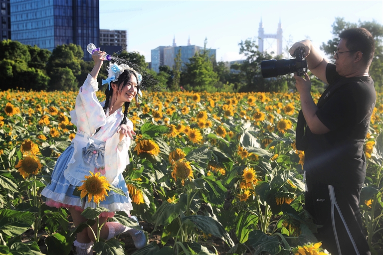 近日,新城茶山浦河东侧种植的大片向日葵美丽绽放,吸引众多市民打卡 记者 陈永建 摄