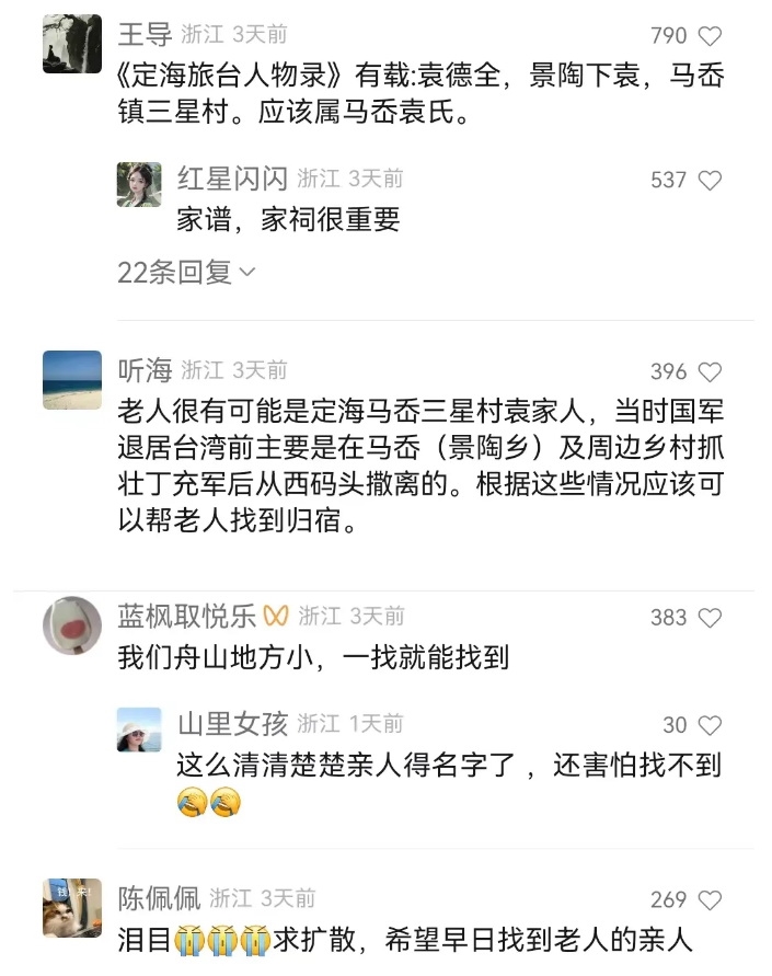 “阿祖是浙江舟山人,叫袁德全。”近日,台湾女生“竹竹”在网络上求助,希望找到曾祖父生前的大陆亲人。她的舟山朋友联系了“竞舟”寻求帮助。