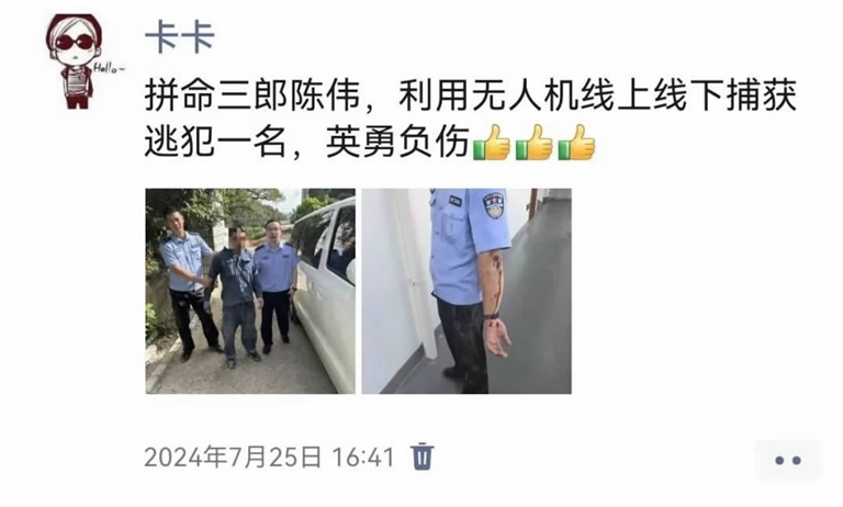 陈伟紧追不舍,逃犯钻过护栏跑向路面。陈伟又一个箭步跨越,不料因护栏高且为下坡路段,陈伟不慎摔倒受伤。他忍着剧痛,瞬间从地上爬起,奋起直追上百米,成功将已经累得气喘吁吁的逃犯一把抓获。