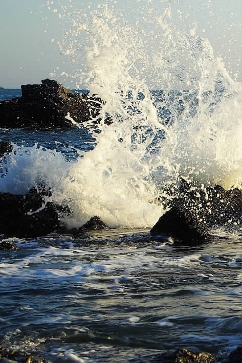 晴朗的下午,我闲情逸致地走过一条蜿蜓的岛上小路,越过一座不高不低略陡的天然山坡,穿过一方藤草缠绕的茂密松树绿林,欣然来到了心之所想的山崖海岸。翛然遥望海面,满盈盈的海水,照在阳光之下,水面上一片金光。此时此刻,我坐在那块熟悉的光溜溜牛背形状平石上,等候“海浪之戏”开幕。