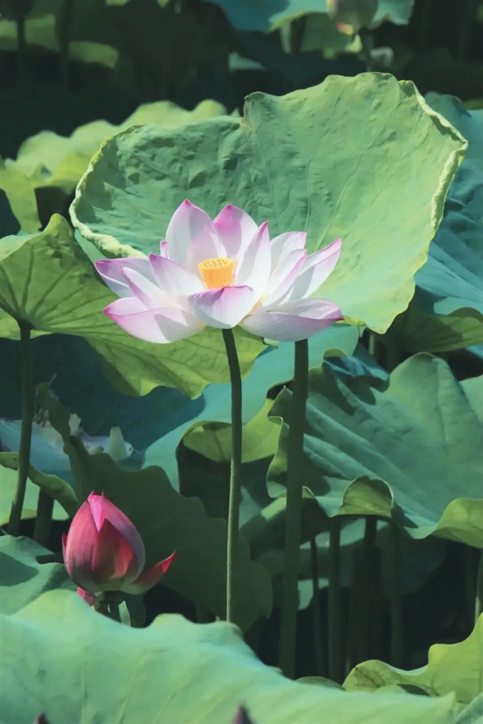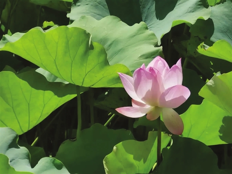 在一片片浓密的绿中,探出一朵朵粉色荷——亭亭玉立、恬淡宁静,更添了几分禅意。夏日的暑气,在悠然绽放的荷花和碧绿如伞的荷叶中慢慢消散。