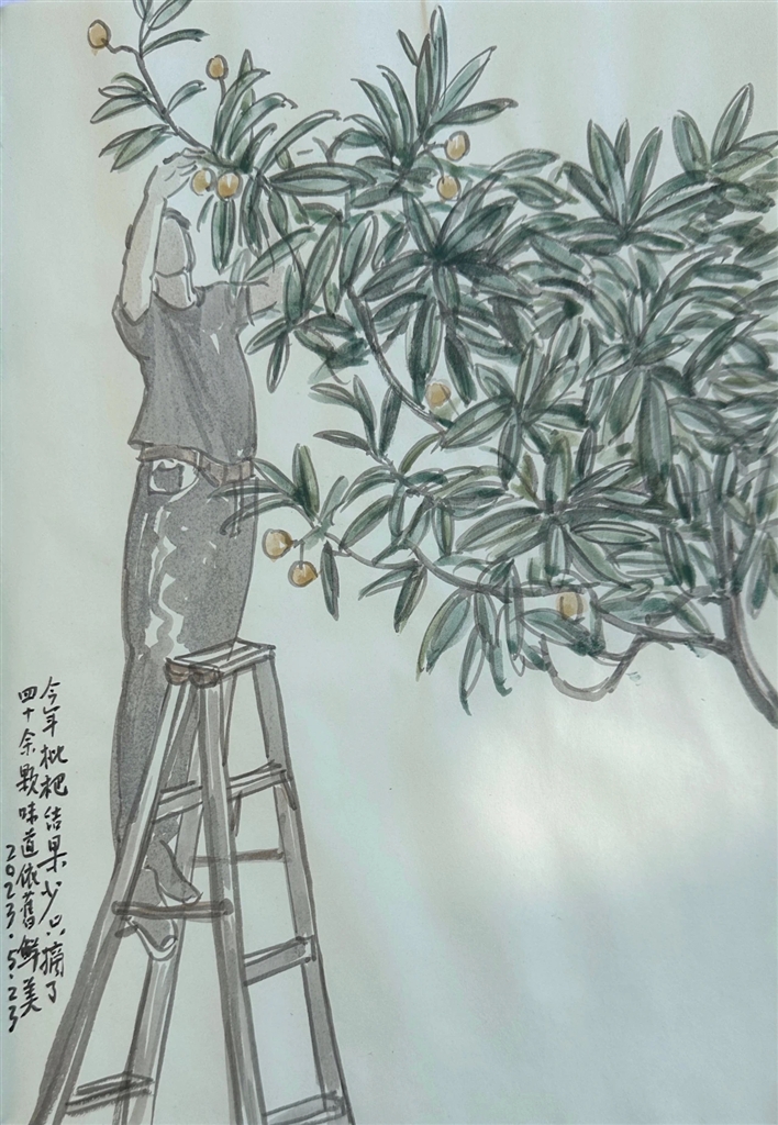 “我这算是以画记事。”徐锋笑着说,人家是写日记,自己则是“画日记”。而这个想法还是受女儿的启发。徐锋一家人都爱好画画,一家三代人还曾经合办过一次画展。女儿徐霜晴是清华大学计算机系毕业的,虽没有正式学过绘画,但她业余时间也喜欢画上几笔,用画画来记录生活。“她一直有记录的习惯,有的时候是用画笔,有的时候用摄影的形式,我看看也蛮好的。”徐锋决定向女儿学习,从2019年开始,他也试着以画记事,“前面几年每天画一张,就像记日记一样。现在一个月画十多张。”徐锋说,到现在为止,自己已经画了4本,今年开始画第5本。
