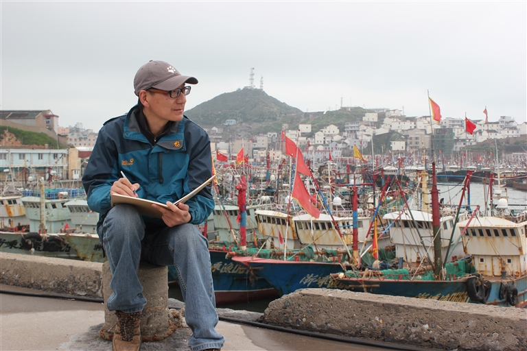 去枸杞岛采风时,看到一些外地渔民在码头上等着鱼货到岸,徐锋就赶紧捕捉下了这个画面,记录在了本子里。