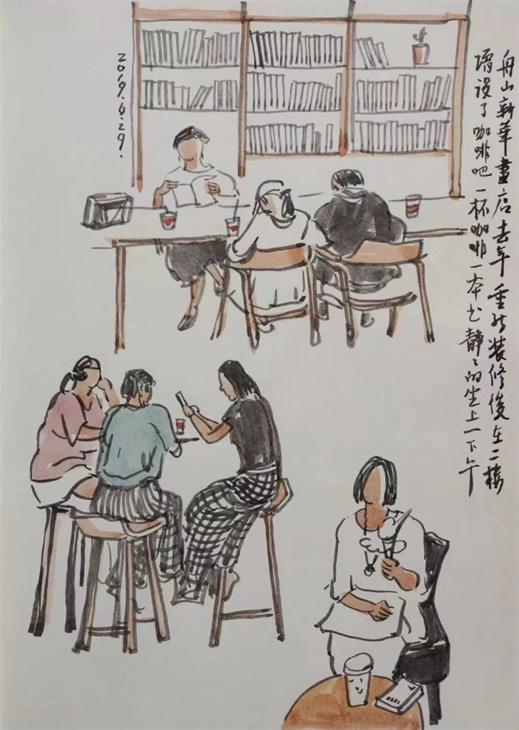 “舟山新华书店去年重新装修开业后在二楼增设了咖啡吧。一杯咖啡一本书静静地坐上一下午。”字的左侧是市民坐在咖啡吧里看书喝咖啡的画。