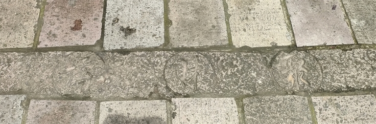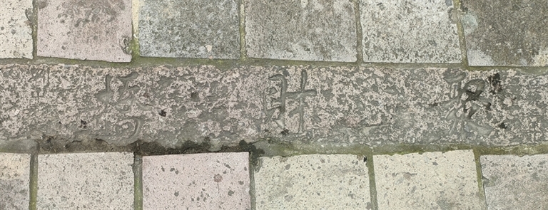 走在东沙古镇,从最热闹的解放路口,我们找到自由弄,向东,一路查找古桥遗迹,走到横街口,还是没有发现古桥踪影。忽然,低头一看,发现了石板路上镶嵌着一根石条,上面隐约有字,再弯腰仔细查看,石条上“聚财桥”三字清晰可见,两侧竖刻“宣统二年”“刘中和”,整根石条长约2.60米,宽约0.24米。在三四米远处,我们又发现街面镶嵌着另一根石条,石条上“聚财桥”三字都画上了圆圈作为修饰,两侧也分别竖刻“宣统二年”“刘中和”,整根石条长约2.77米,宽约0.24米。“刘中和”是东沙古镇的商号,也就是建造“聚财桥”出资者。