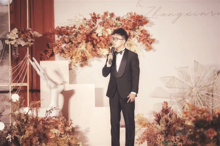 “新人在台上对彼此说的话,我倾向于让他们自己写。有的新郎或者新娘讲的话会让你感受到他们的爱是很真、很浓的,特别是一些从校园恋爱一路走来,中间经历过各种挫折最后修成正果的,他们的话会很触动我。”