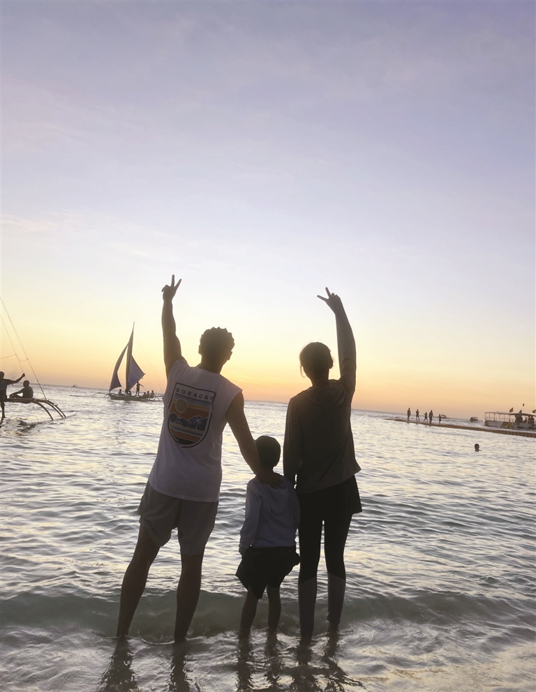 李彬洁和家人在海边留影