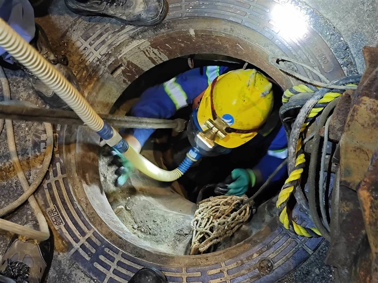 “有没有短一点的铲子?拿把短铲子给我……”一位全副武装的维修人员,一边在防坠锁的保护下降到井底,一边朝井外喊话,索要作业工具。拿到铲子后,他迅速下到至脚踝处的污水中,清理淤积物。