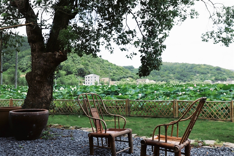 推开玻璃后门时,一阵风带着荷花的清香扑面而来。我们当即决定舍弃空调屋子,在这屋后的月台上赏景、纳凉。月台宽阔,以木板与碎石铺就,与百亩荷塘相连。正是荷花怒放的时节,“接天莲叶无穷碧,映日荷花别样红”。一棵瘦弱的樟树茕茕孑立于荷塘前,与挨挨挤挤的荷花相比却不显孤单。树下放一水缸,好事的孩童摘了荷花插在缸内嬉戏。缸边放一把竹椅、一张竹几。午后的阳光懒懒地从树荫落了下来,人坐于光下,以荷塘为背景,以树枝为前景,抬头、闭眼、深呼吸……如此出片之地,自然成了打卡的热门取景点。