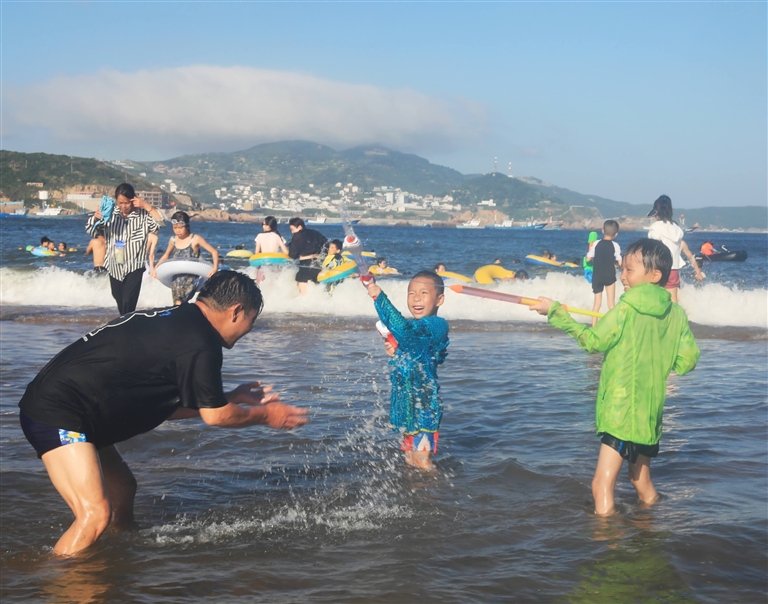 盛夏时节,海风轻拂。近日,在嵊泗县枸杞岛大王沙滩,许多市民和游客带着孩子在海边游泳、戏水,感受海岛生活的悠闲与自在。记者 陈永建 滕海平 摄