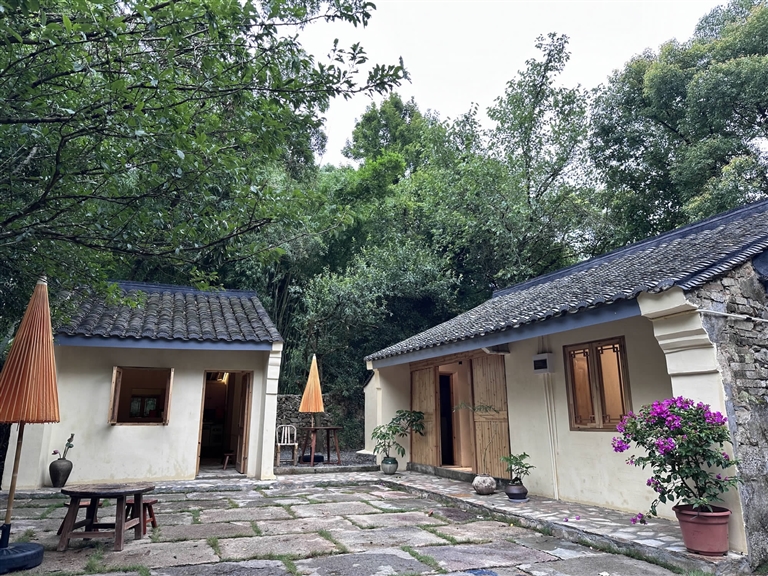 现在开放的黄泥岙村,比起我刚看到的村落,更多了生命力。它依然保持着明末清初的样貌,原本的荒山泥地铺着旧石板,如同最初时的计划,做到了以旧如旧。我们的村口茶铺和两间小屋的竹林别院也如约开张,很受游客们喜爱。