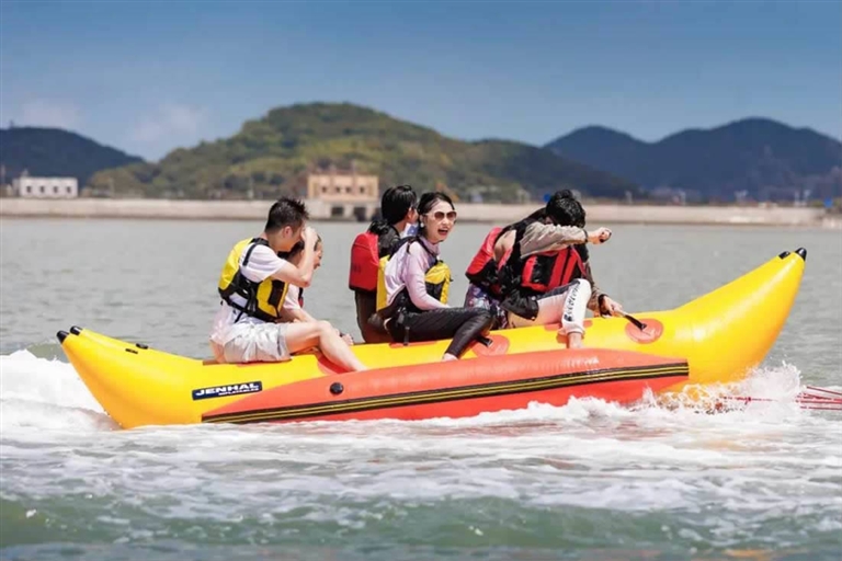 香蕉船是最受欢迎的海上娱乐活动之一,因其船的形状像香蕉状而得名。通常由一艘摩托艇拖着在海上飞驰,随着海浪的起浮,香蕉船也犹如一匹脱缰的骏马,自由穿梭在碧蓝的大海之中。和并肩作战的“队友”共同在未知的海域中痛快畅游,去经历更加波澜壮阔的风景,感受速度带来的激情。坐上去,犹如在海上冲浪闯关,根本不想下来。