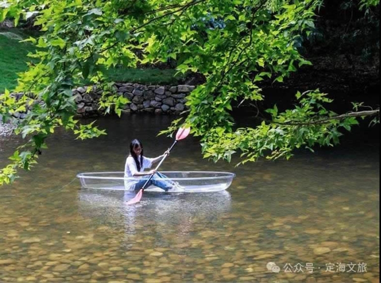 你还可以在这里解锁泛舟湖上的体验。划着透明小船,泛舟翠潭上,周边绿意环绕,自带清凉感,仿佛置身于自然的怀抱。