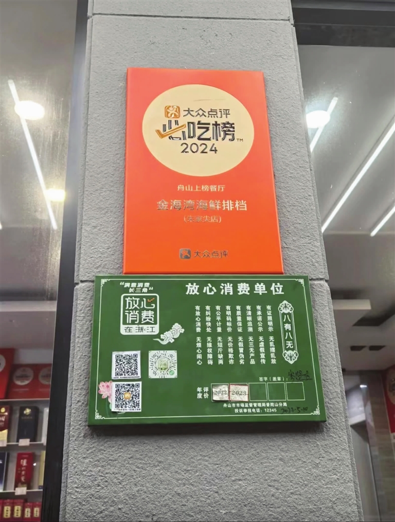 打开2024大众点评必吃榜,上榜的舟山区域的六家餐饮店中,就有朱家尖的金海湾海鲜排档。