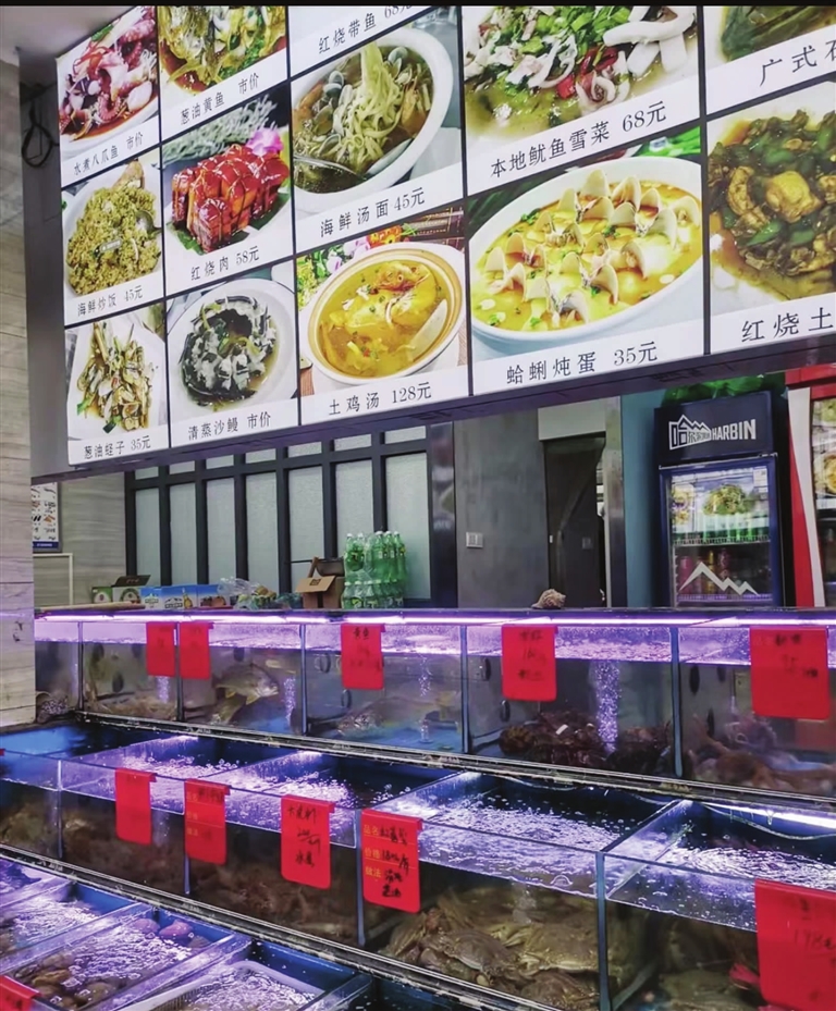 点餐区,偌大的海鲜池,各种叫得出名字或叫不出名字的海鲜,看得人眼花缭乱。店里主打的虽然是海鲜,但到店的客人大都来自五湖四海,有着并不一致的口味。相较于舟山人烹制海鲜的原汁原味,北方客人更青睐重口味的烧法。咸淡难以统一,要想客人吃得满意,还得多沟通交流。