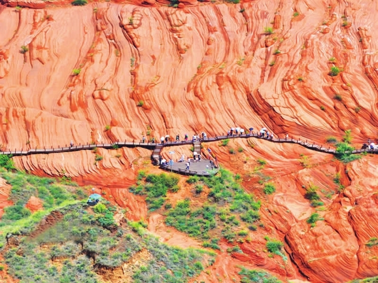 陕西榆林市靖边县有个景点称为波浪谷,也叫红砂岩,学术上被称为“砒砂岩”,成于古生代二叠纪和中生代三叠纪、侏罗纪、白垩纪之间。那些层层叠叠的石头就像一大批铺盖在地面上浸染过后晾晒的红色布匹,一层层、一卷卷、一盘盘在夕阳的渲染之下异常鲜红;又似黄土中冒出的一股红水缓慢地向低洼处流淌。