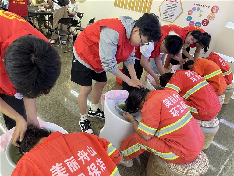 舟山有“槿树叶汁洗头”过七夕的习俗。当天活动现场,大学生志愿者提前采摘了新鲜的槿树叶子,清洗干净放入脸盆,再使劲揉搓出汁液,用来给环卫工人们洗头。河南籍环卫工人管成芳说:“我来舟山20年,还是第一次这样过七夕,很特别。”活动结束后,主办方还向环卫工人们送上了沐浴露、洗发水等用品。