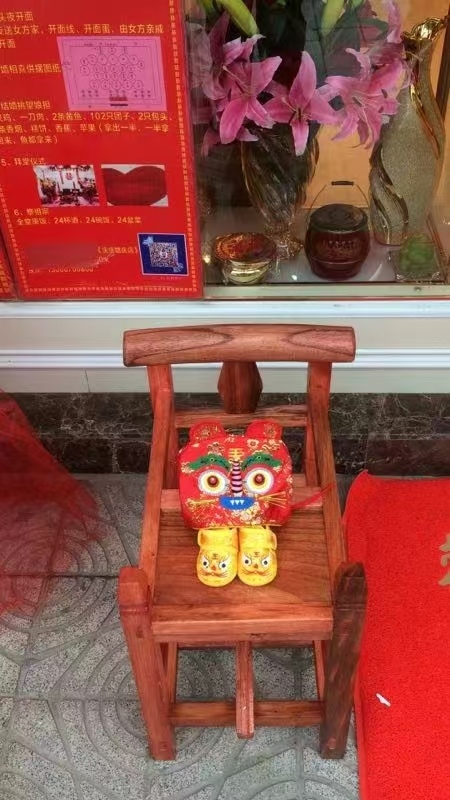 说起一些婚礼习俗的来历和含义,“饼干”滔滔不绝:“岱山的婚俗‘飨喜’会用到整头猪、整头羊,包括荤菜、素菜、糕饼、水果在内的七样东西,方言是‘七飒’;还有一种传统的婚俗是‘坐笸’,就是在一把老式婴儿椅上放虎头鞋、虎头帽,意思是祝新人早生贵子……”