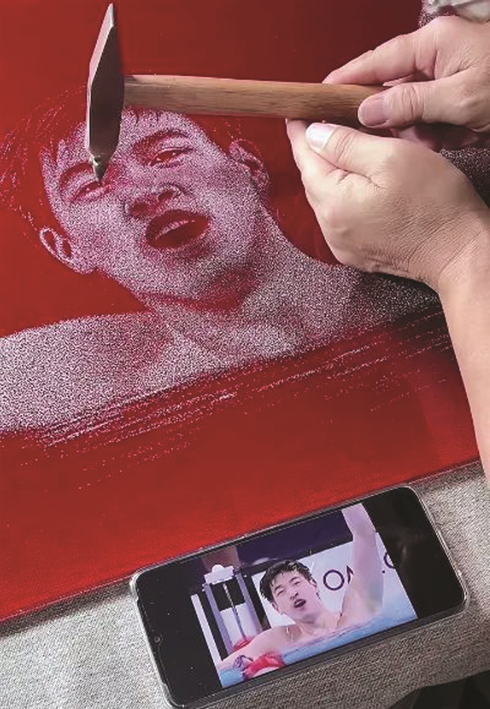 “我总共花了3天的时间,敲击了近百万锤,这才在玻璃上‘画’出了潘展乐的肖像。”该画的作者刘金铎对扬子晚报/紫牛新闻记者说,当时他拿着手机反复观看了潘展乐夺冠的视频,并定格了潘展乐在泳池中挥舞手臂的动作,以此为蓝本,创作了这幅独特的“玻璃画”。