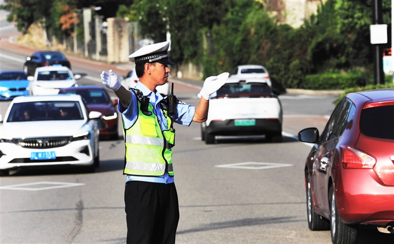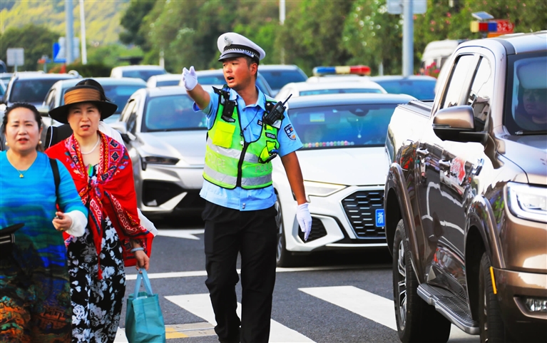 △旅游高峰到来,朱家尖南沙景区车流较大,普陀山交警大队全体警员执勤在道路上