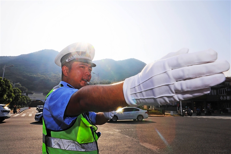 △随着朱家尖南沙景区车流加大,执勤中的交警十分忙碌