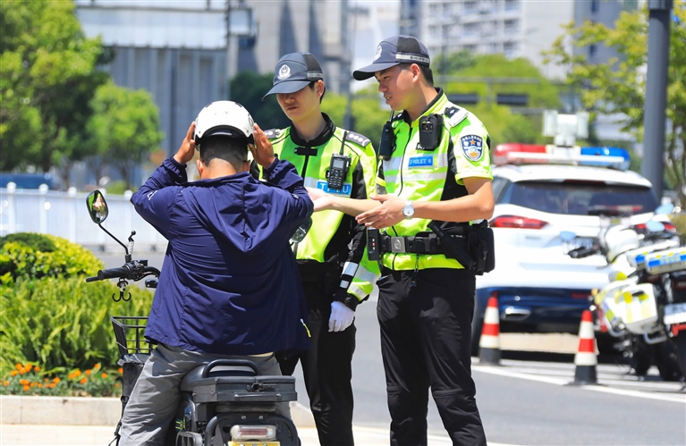 △烈日下交警对路口未正确佩戴头盔的驾驶员进行提醒纠正