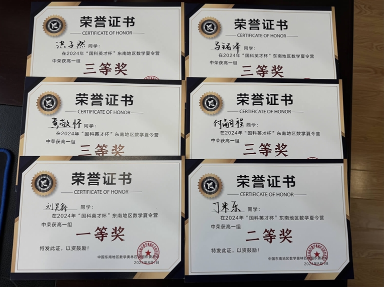 近日,2024年中国东南地区数学夏令营落幕。舟山中学共有13名学生获奖,其中刘昊鑫获一等奖;丁米乐、林宣吟、乐新俊等3名学生获二等奖;付嗣程、黄敬怀、洪子然、马铭泽、李佳函、庄承翰等6名学生获三等奖;庄云麟、袁琪智、王麒遇等3名学生获优胜奖。这也是舟山中学近10年来参加各类数学竞赛所取得的最佳成绩。
