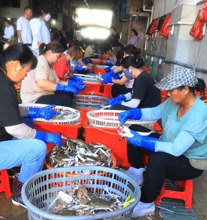 工人忙着将梭子蟹进行分拣、捆扎、装筐等作业 记者 陈永建 摄