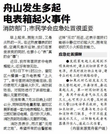 最近,我市接连有居民家中电表箱起火。一起发生在7月28日晚上6时41分,普陀区展茅街道一室内电表箱起火;另一起发生在8月3日下午1时22分,普陀区六横镇一室外电表箱起火。幸好都被居民及时发现并扑灭,没有酿成更大的后果。虽则如此,电表箱起火已发出了危险信号,有关方面应以时刻放心不下的警觉落实安检、杜绝隐患。