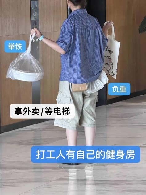 “左右手各举着外卖与帆布包,重复做出举起、放下的动作,腰间还系着三个外卖。”有网友称,自己有位同事每次都自告奋勇帮大家去楼下带饭,“她说来回路上等于负重运动了,办公室每天坐太久了,又没时间跑健身房”,就在每天拿外卖或等电梯时运动快充一下,省下一笔健身钱。