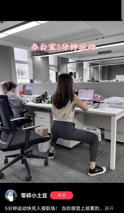 座椅普拉提、工位扎马步、桌位开肩开背……近日,在社交平台上,“5分钟运动快充入侵职场”的话题引发热议,在繁忙的工作中,有人称这是“打工人有自己的健身房”。