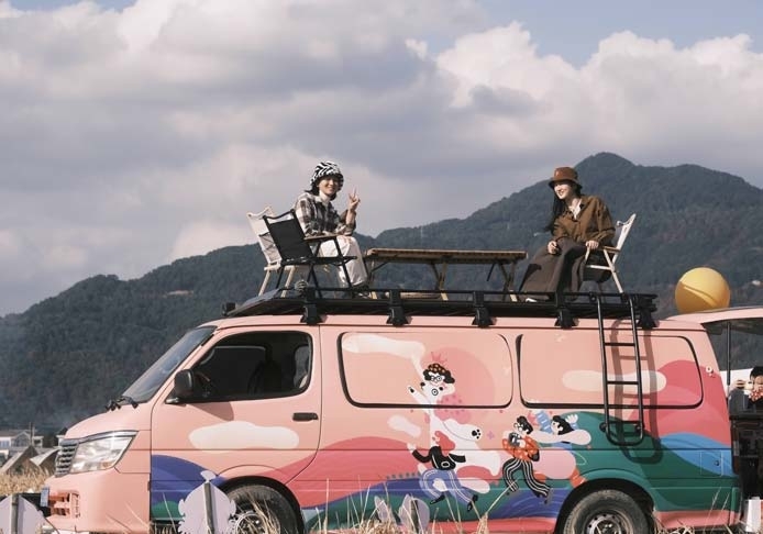 “浪浪车”是一辆粉色的车,好些车是在后备箱营业,车身大都没有整体的设计外观,但我们有车衣设计,上面的图案也是以马岙为原型:马岙的山,马岙的小房子,蓝色的海,那几个卡通人像就是我们,在山间自由奔跑。
