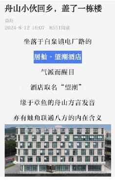 坐落于白泉镇电厂路的居舢·望潮酒店气派而醒目,酒店取名“望潮”,有触角联通八方的内在含义。这是返乡创业青年周鼎华经营这家艺术酒店的初心,希望“链”上更多的青年人才,为乡村带来更多产业和活力。