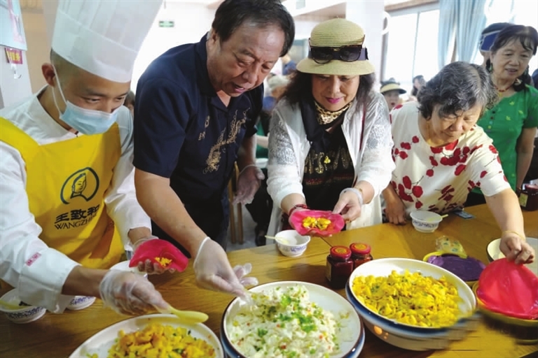 8月14日,当日正值末伏第一天,众多当地社区居民来到北京市西城区白纸坊街道华方居家养老配餐中心,品尝利用腐乳汁制作的“新式”烙饼摊鸡蛋。在中国北方地区,有“头伏饺子二伏面,三伏烙饼摊鸡蛋”的民间习俗,百姓曾旨在以烙饼摊鸡蛋等食物,补充身体在经历夏季后消耗的能量。中新网 图