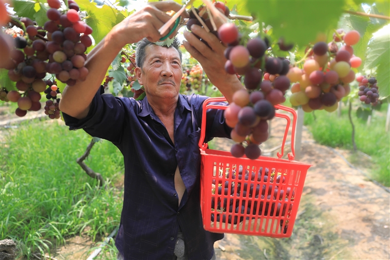 昨天,定海区白泉镇河东村万锦湖葡萄种植基地内,种植户陈义吉的工人们正忙着采摘葡萄。据了解,该农户种植有2.67公顷大棚葡萄,有巨峰、美人指、阳光玫瑰等7个品种,目前陆续上市,十分畅销。记者 陈永建 摄