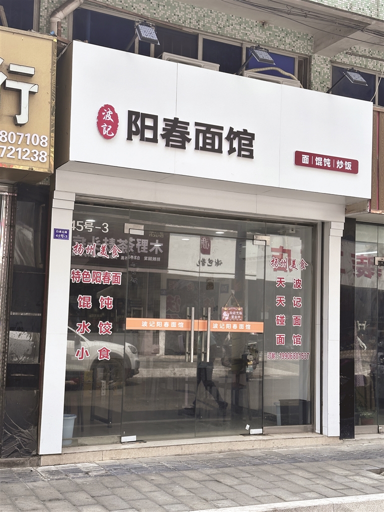 白虎山路45-3号的位置,门面确实小小的,和吃到的凉拌面一般,简单,清爽。雪白的门头,嵌着四个黑色大字“阳春面馆”,前缀红底白字的竖列“波记”二字,后面一排小字,补充着店里的品类:面、馄饨、炒饭。