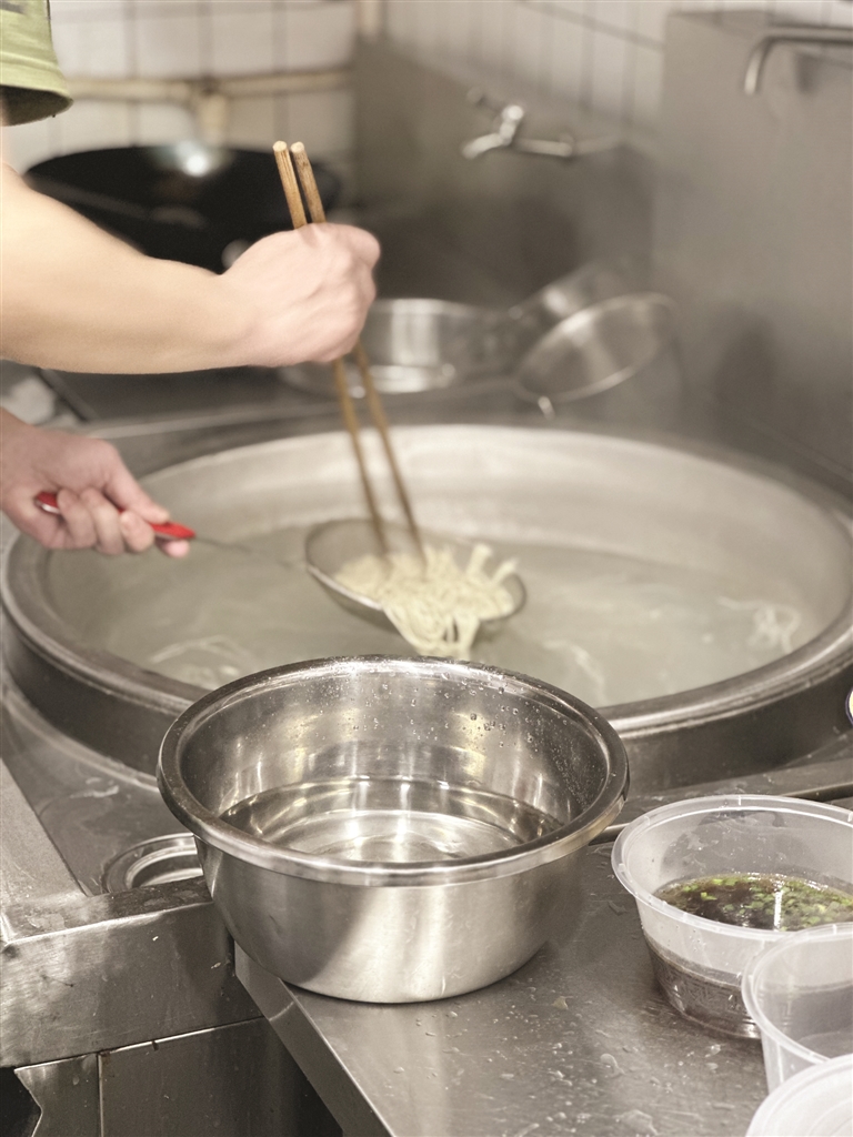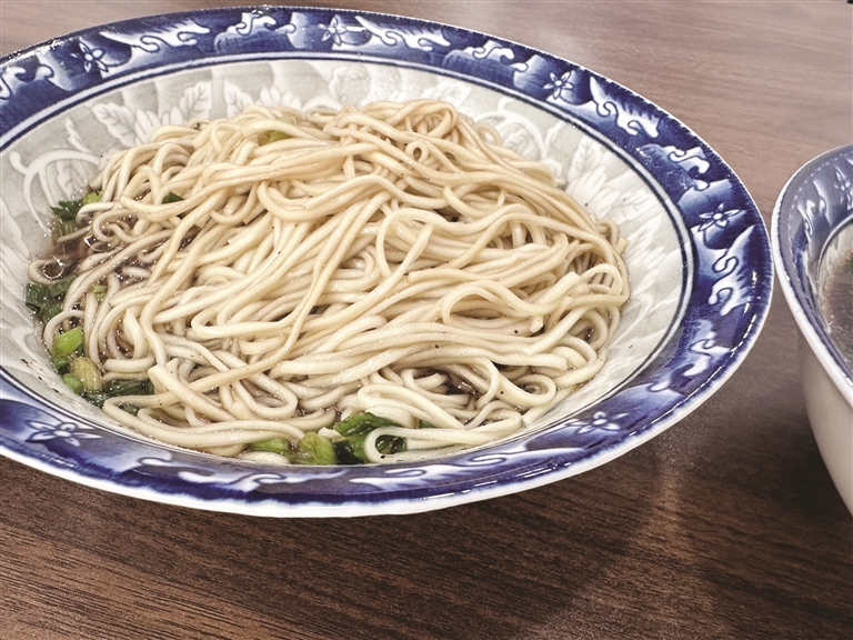 大叔这才重回炉灶,大锅里的水重新沸腾起来。煮完的阳春面捞出后,在冷水里过凉,再装入事先调好的面汤中。本以为不加其他食材的阳春面,不过是一碗清汤寡水的面,可这面条虽细却柔韧有劲。干拌原本就是干的,大叔怕本地人吃不惯,特意多加了些汤汁,面条的风味也更加浓郁。