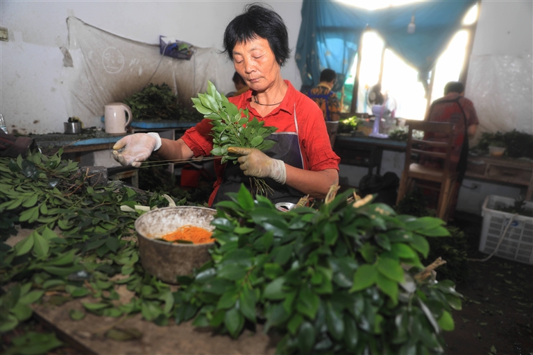 昨天,在定海区干石览镇龙潭村红柃共富工坊内,工人们正忙着对柃木枝进行加工并捆扎成束。据了解,每年七八月是该作坊的生产旺季,日生产14000余束柃木,出口日本,十分畅销。据悉,该共富工坊年产值在300万元到400万元之间,解决当地近70名村民就业。记者 陈永建 摄