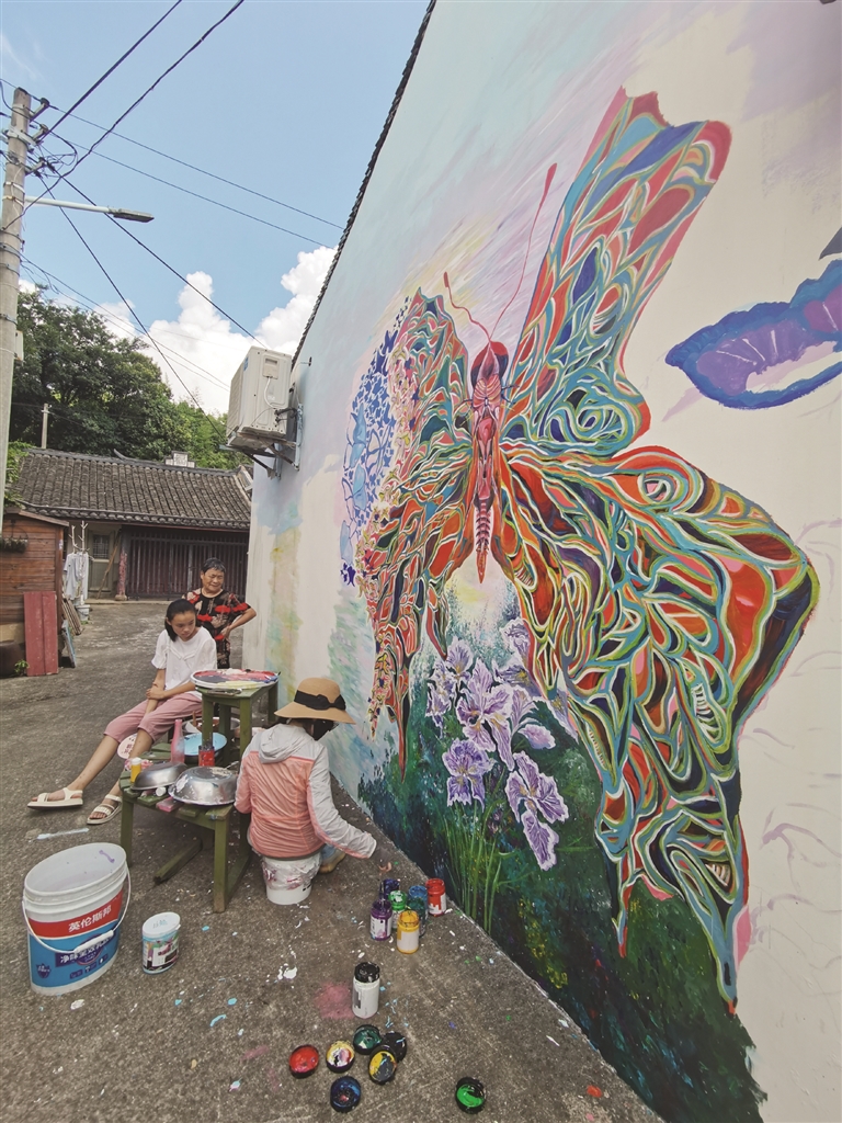 说到坚持在烈日下作画的动力,洪莺歌随手擦掉汗说:“这只蝴蝶不仅美丽了我们家的庭院,也为村里增添了一份色彩,能为美丽乡村尽一点力,我很有成就感和荣誉感。”