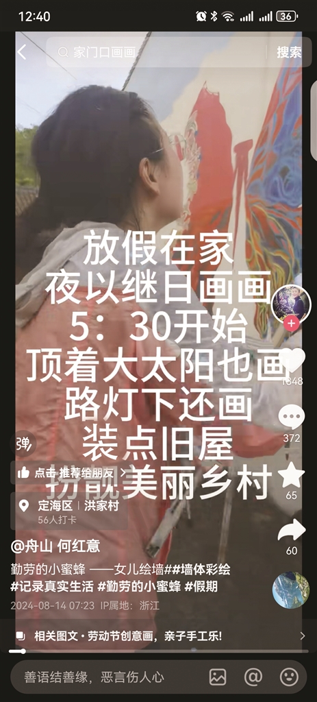 “我家勤劳的小蜜蜂,放假在家里画墙绘,夜以继日画了一只大蝴蝶。一大早5点半就开始画了……”近日,舟山市民何红意在抖音平台上发布的一则女儿放假在家画墙绘的短视频,引网友关注,阅览量10万+,点赞1800+,不少人评论,“为小姑娘的生活态度点赞”“勤劳,有创意”“让我家孩子来看看,这就是好的榜样”。