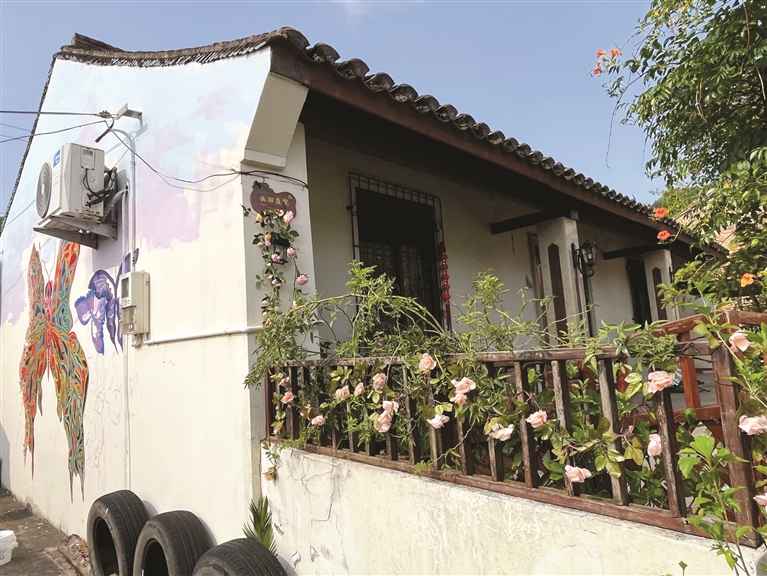 洪莺歌一听就立刻应下,并开始认真思考设计。一个晚上的时间,洪莺歌就在选择主题上确定了蝴蝶,并在第二天开始购买涂料、粉刷墙面,“我的画没有参照物,就是比较随性,一步步来。蝴蝶的构想就是因为我家的庭院有很多花花草草,且色彩丰富。同时蝴蝶的谐音是‘福叠’,福就是福气,叠就是重叠,其意义祥和,我觉得这也响应人与自然和谐共生的理念。”