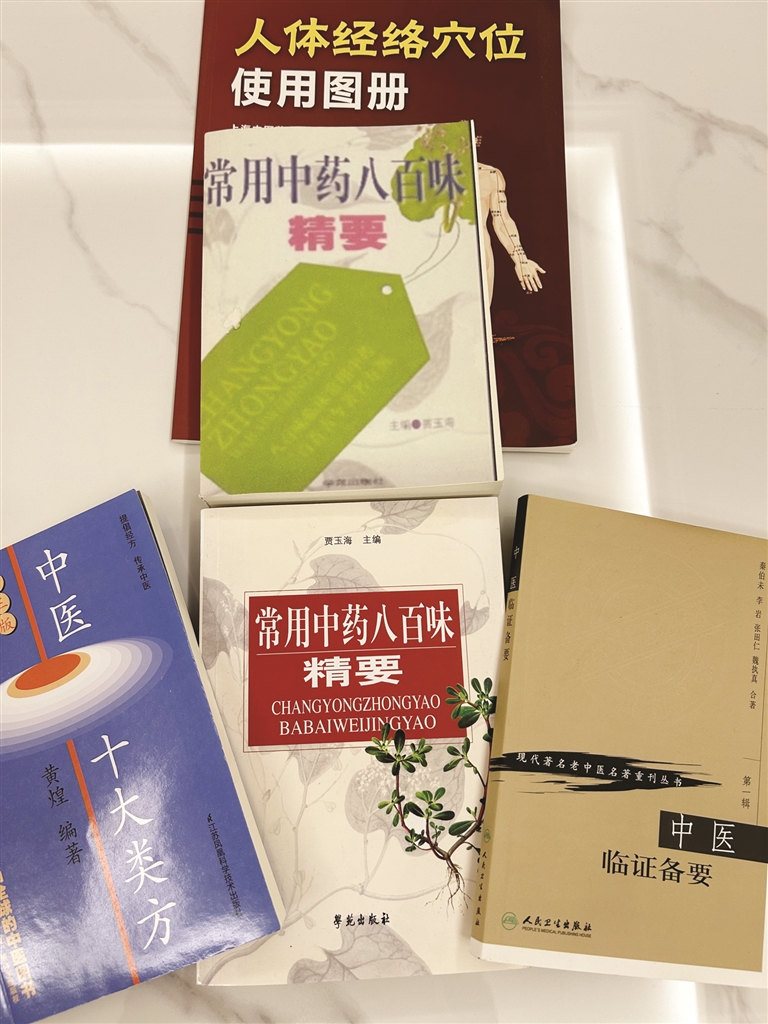 今年53岁的包怡也是舟山老年大学中医养生课的学员。她报名课程完全出于兴趣,“我舅舅是一名老中医,我可能受他的影响,从小就对中医药文化特别感兴趣。以前在医院看完病拿到一个药方,我都会回家自己查这个药材有什么作用、那个药材怎么吃。我还有好多讲述中医知识的书籍。”包怡告诉记者,上了中医养生课后,她基本掌握了人体经络走向和几个重要、常见的穴位,她还根据老师上课教授的艾灸手法,给自己和丈夫做艾灸,熏神门穴和涌泉穴,极大改善了睡眠质量。