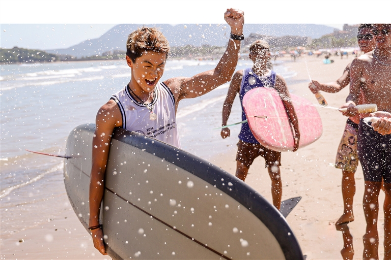 8月25日,第二届东沙冲浪公开赛在朱家尖东沙海滩圆满落幕。图为选手赛后庆祝。