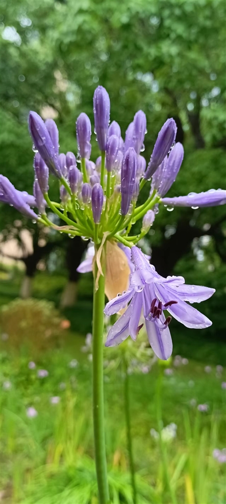 在雨丝纷飞的公园里,只是不经意的一瞥,竟在路途中邂逅了一片百子莲。那时,我尚不知其芳名,只觉得在如此蓬勃的绿意中,掩藏着一种难以言表的唯美和浪漫。