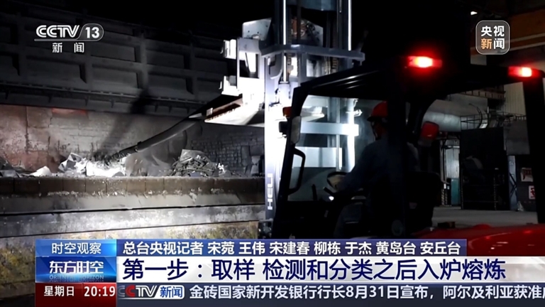 在青岛西海岸新区的一个铝加工厂,一辆装载着家电拆解铝的运输车正在车间开展装卸作业,工作人员对这些废铝进行取样、检测和分类,将成分合格的废料进行配料入炉熔炼。