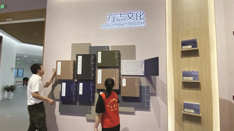 方志馆入口处设置“舟山方志”书籍区,陈设有本地志书、年鉴、文献丛书及其他地区志书等,可供参观者翻阅,另设数字方志馆互动屏,可通过电子交互的形式了解舟山历代名人,还可以扫码下载市县电子方志到手机等移动端。